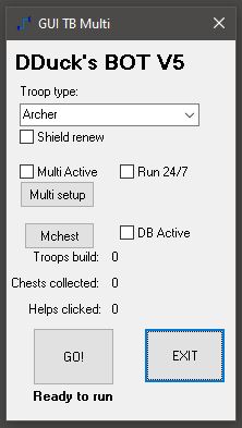 *Go! will start the helper mode. It will build one troop at the time and click the help buttons on the way, After 10 troops it will do a chests collection and go back to helper mode.